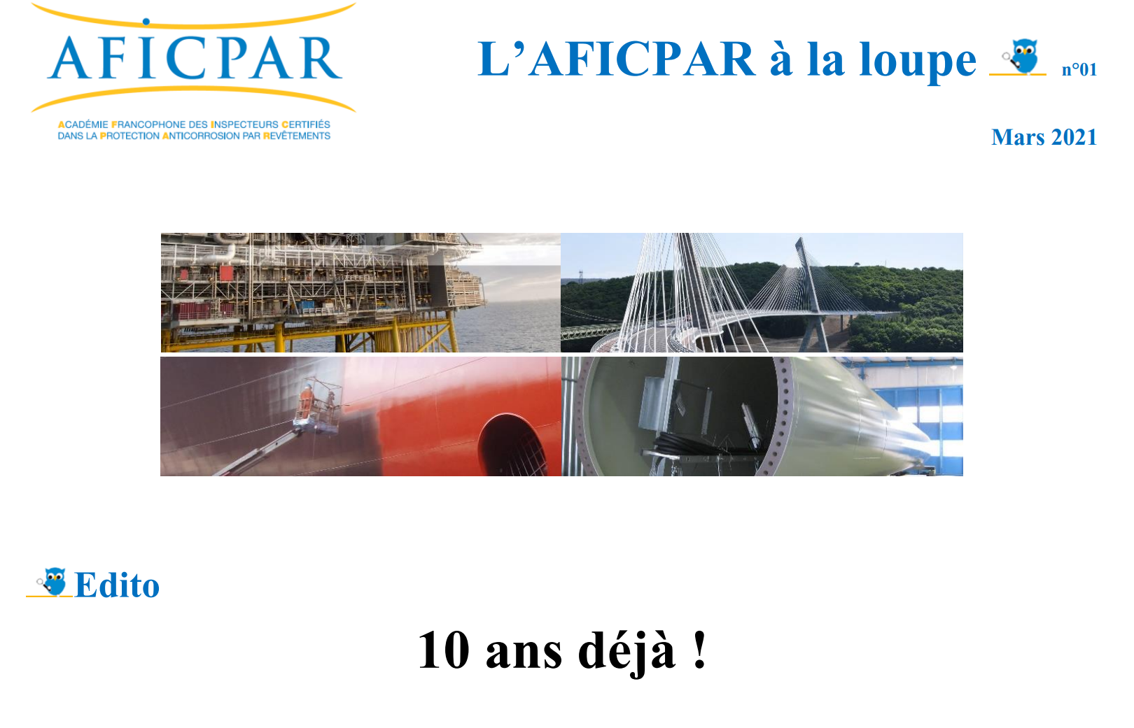 Je suis fier de pouvoir vous communiquer le 1er bulletin de notre association qui regroupe les inspecteurs certifiés FROSIO ou ACQPA/FROSIO. Le choix du référentiel NS 476 date de notre première expérience aux ACH et je me souviens que notre regretté JOSE MENACHES disparu trop tôt et premier président de notre Association l'AFFICPAR m'avait dit : "Tu verras Christophe la filière anticorrosion est en marche ".